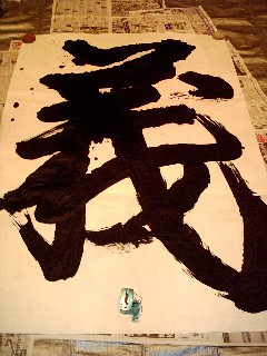 「義」 2006年に国際交流で マレーシアに行くために 揮毫を練習しているときの作品です。 展示用に準備していった、色んな 作品も、現地で書いたこの作品たちも すべてお渡ししてきました。 なんと! この「義」は、大使館に飾りたいと 言われて、担当者がそそくさと 持って帰られました(笑) 大きさは、縦2.5mなり〜 (下に携帯電話が・・・・) |
