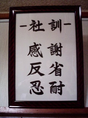 「社訓」 わが社の「社訓」です。 楷書でかくことによって これを見上げるたびに 社員一同 「きりり」と身の引き締まる 気持ちに、なってくれたらと いう思いで、したためました。 毎日、この3つをかみしめながら 生活しています。 目に見せる、という重要さを これをかかげて痛感しています。 |