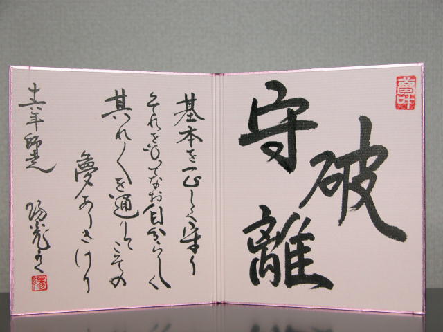 「守破離」 これは、友人から依頼があって 書いた色紙です。 屏風みたいに真ん中が 折れて、たてかけられるように なっています。 友人にこの文字の「意味」を聞いて 自分なりにアレンジした言葉を 左側に書き入れてみました。 ※この写真は、送った方が親切に撮影して おくってくださったものです。 |