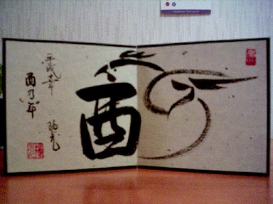 「乙 酉乃年」 2005年は、酉年です。 半年ほどまえから頼まれていた 作品です。 やっと年頭に間に合うことが できました。 はじめて、墨画をとりいれた 作品です。 |